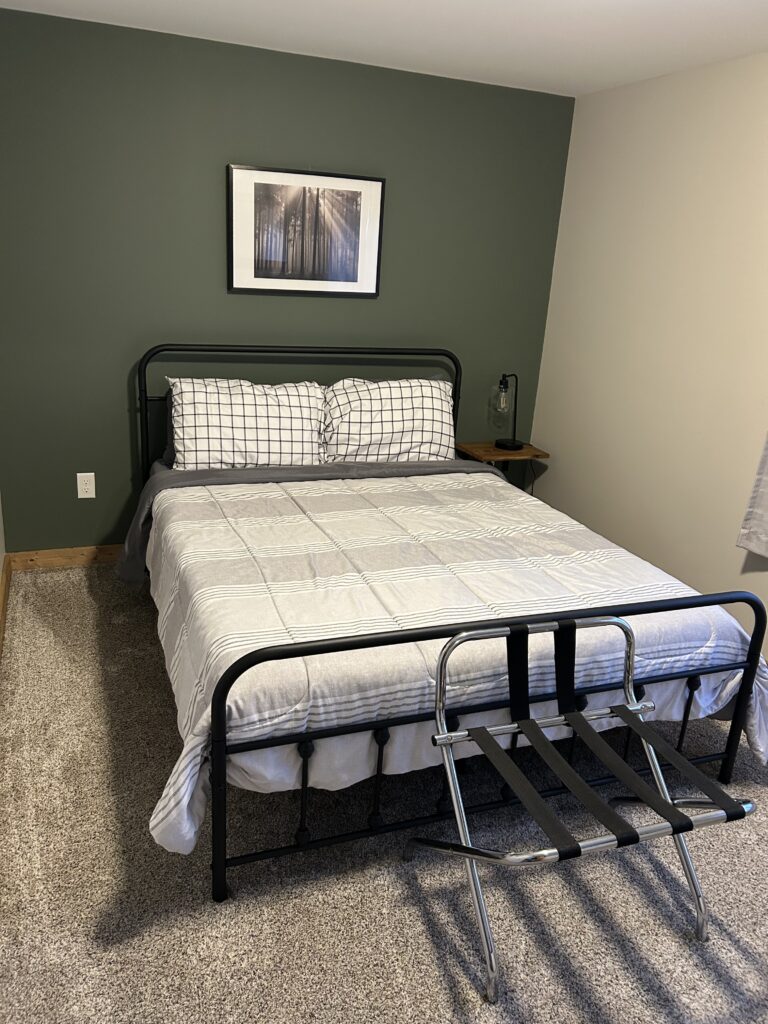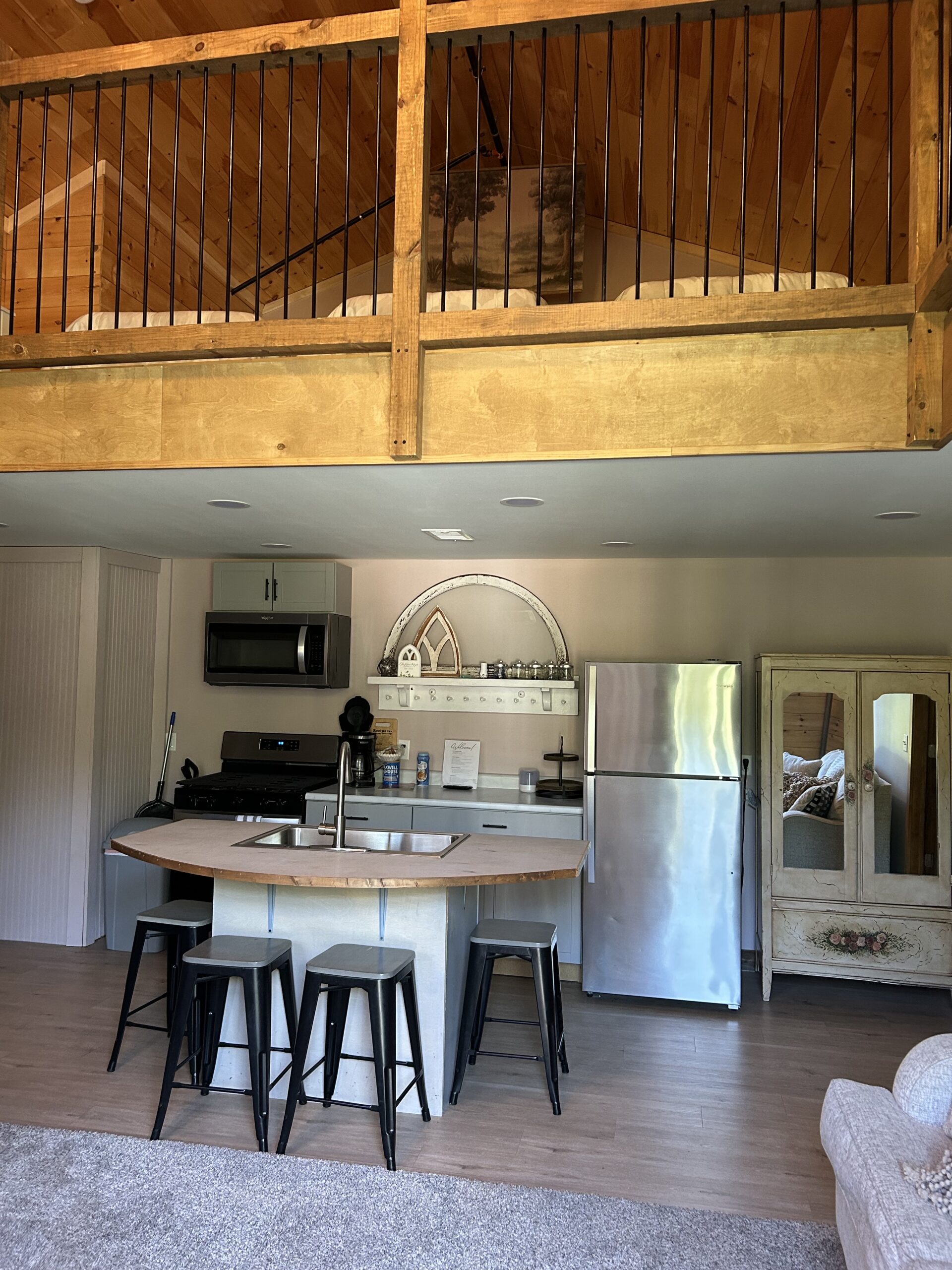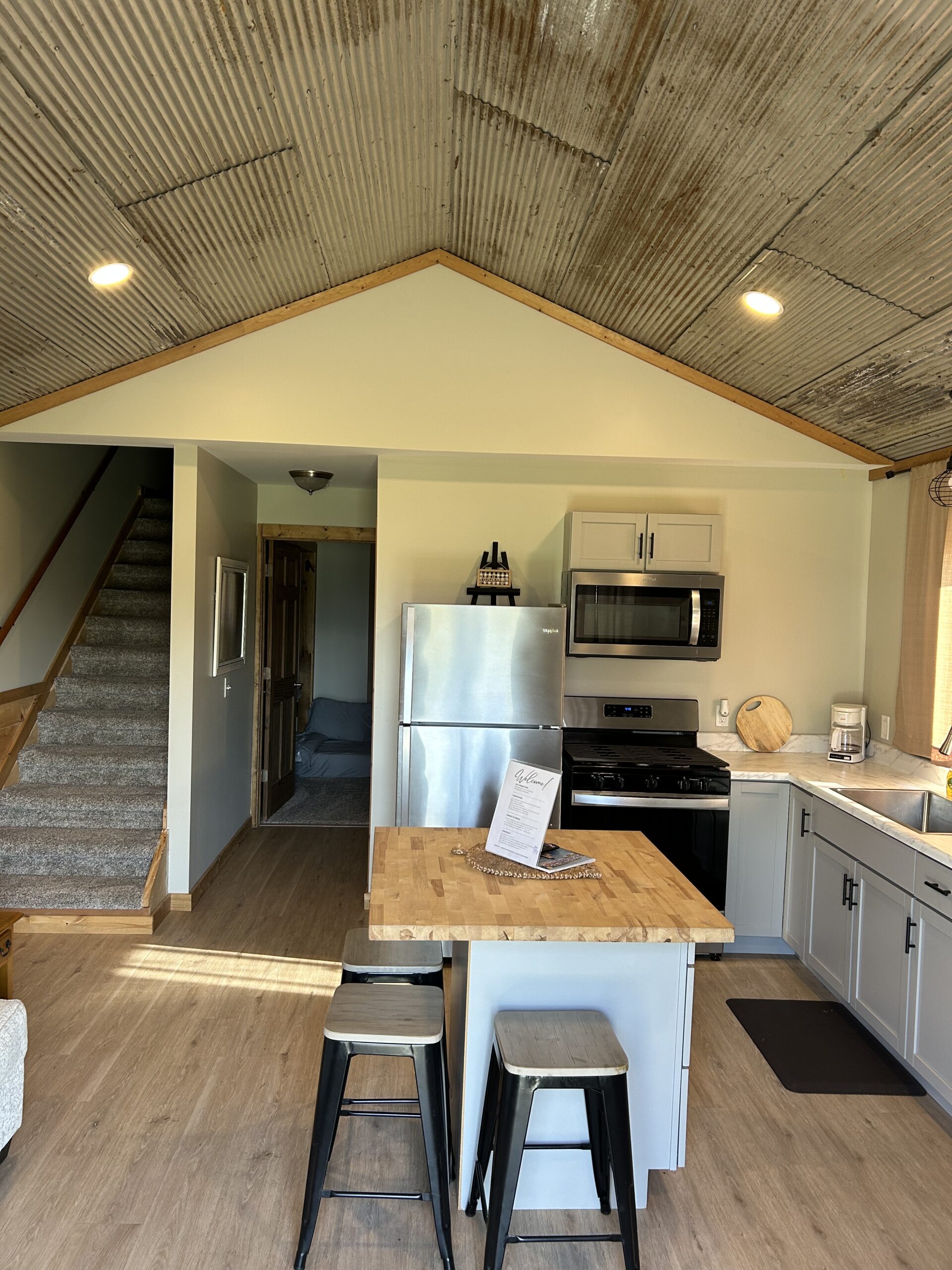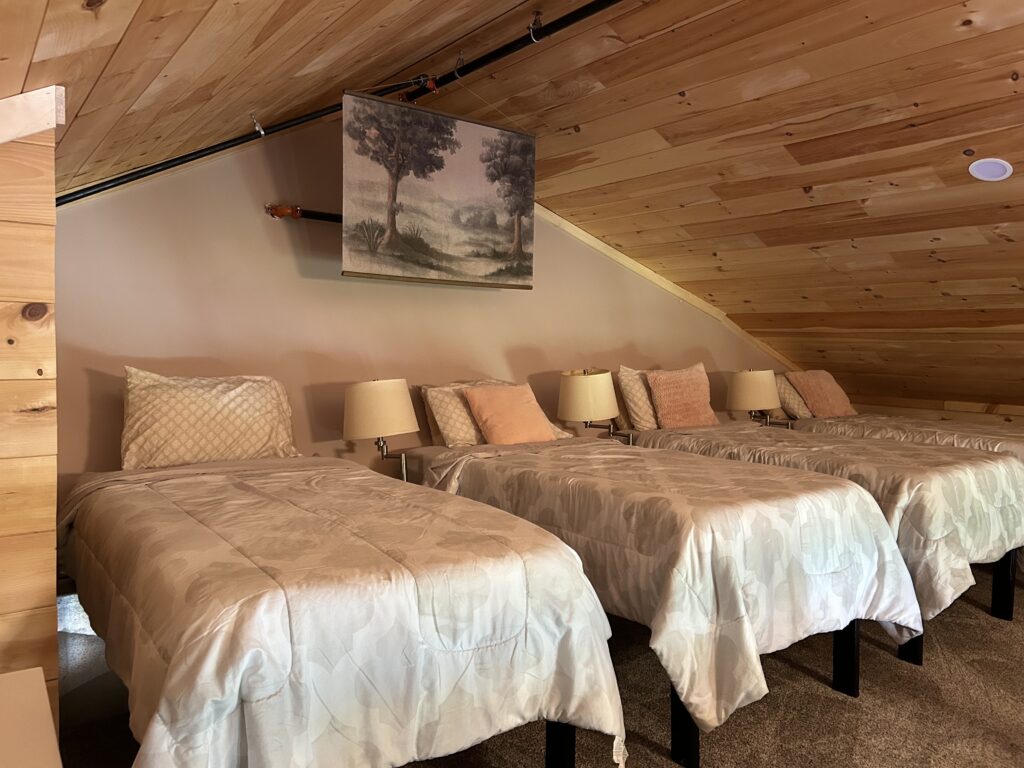Each cabin comfortably sleeps up to 10 guests, featuring 2 queen beds, 4 twin beds, and a queen pull-out couch. Every cabin is equipped with a full kitchen, a modern bathroom, heating and air conditioning, and cozy rustic décor—all just steps away from the barn.